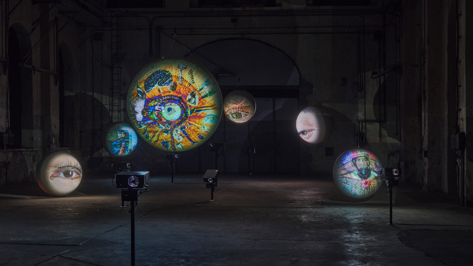 Projektionen auf runde Objekte und Mehrkanal Audioinstallation